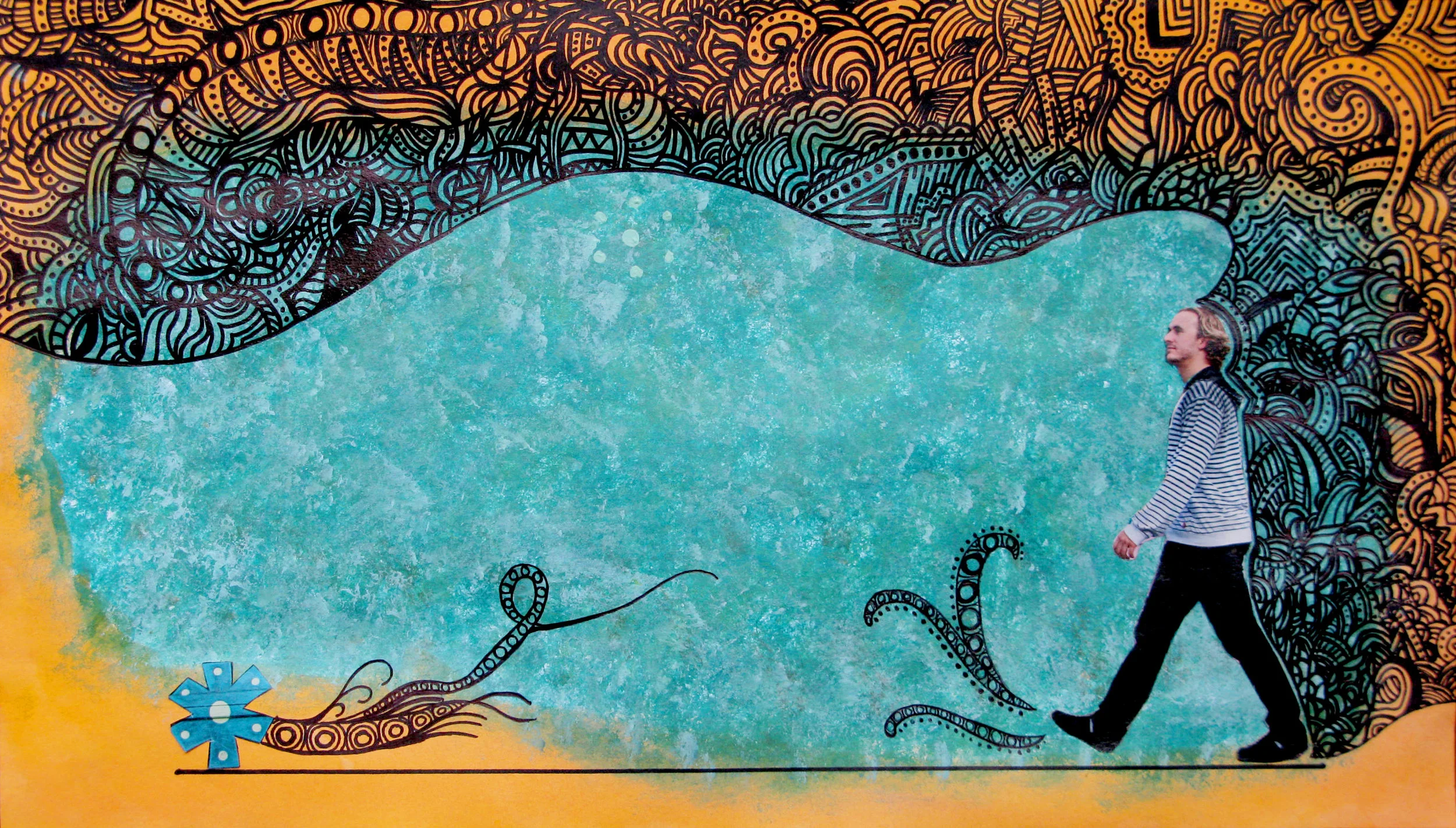 This is a mixed media exploration using watercolor, acrylic paint, collage, and pen.